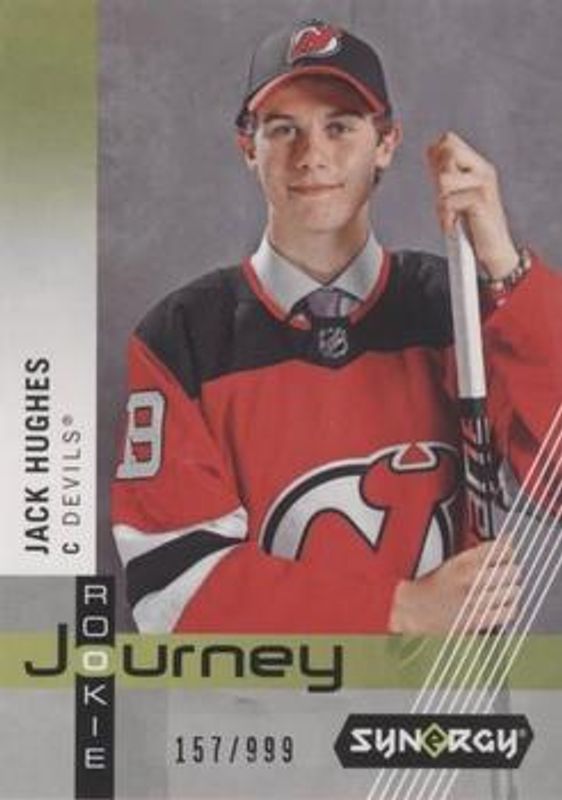 The Jack Hughes 2019 Upper Deck Synergy #RP-16 Rookie NHL Journey Draft Day /999 card is 1 of 21 Jack Hughes' card variations in the 2019 Upper Deck Synergy set being tracked by Sports Card Investor, including Base /19, Red, Red Bounty, Blue /799, and Green /299.