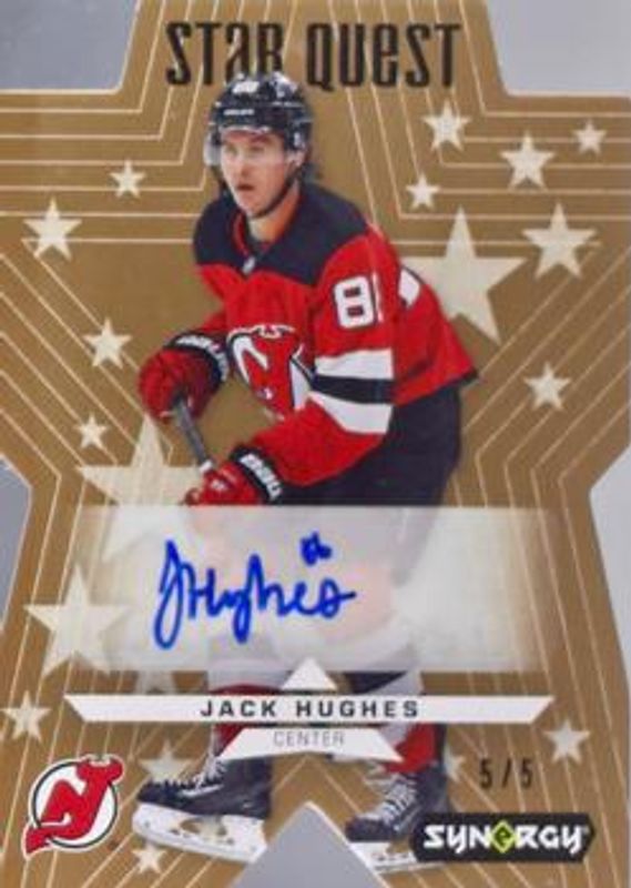 The Jack Hughes 2019 Upper Deck Synergy #SQ-23 Star Quest Die-Cut Autographs /5 Rookie card is 1 of 21 Jack Hughes' card variations in the 2019 Upper Deck Synergy set being tracked by Sports Card Investor, including Base /19, Red, Red Bounty, Blue /799, and Green /299.