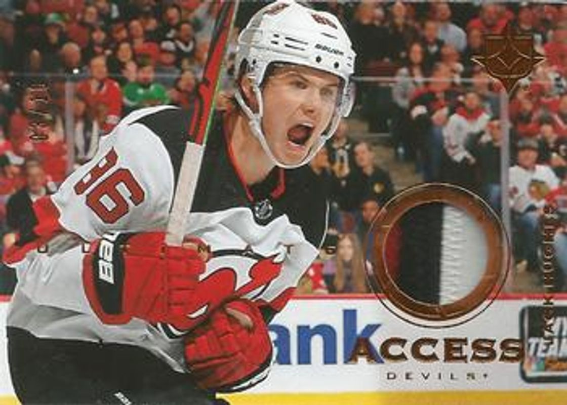 The Jack Hughes 2019 Upper Deck Ultimate Collection #UA-JH Ultimate Access Copper Patch /10 Rookie card is 1 of 29 Jack Hughes' card variations in the 2019 Upper Deck Ultimate Collection set being tracked by Sports Card Investor, including Base /299, Autographed Shields /1, Quest Challenge Achievement VIP Rookies, Signatures Masterpieces, and Ultimate Access Jersey.