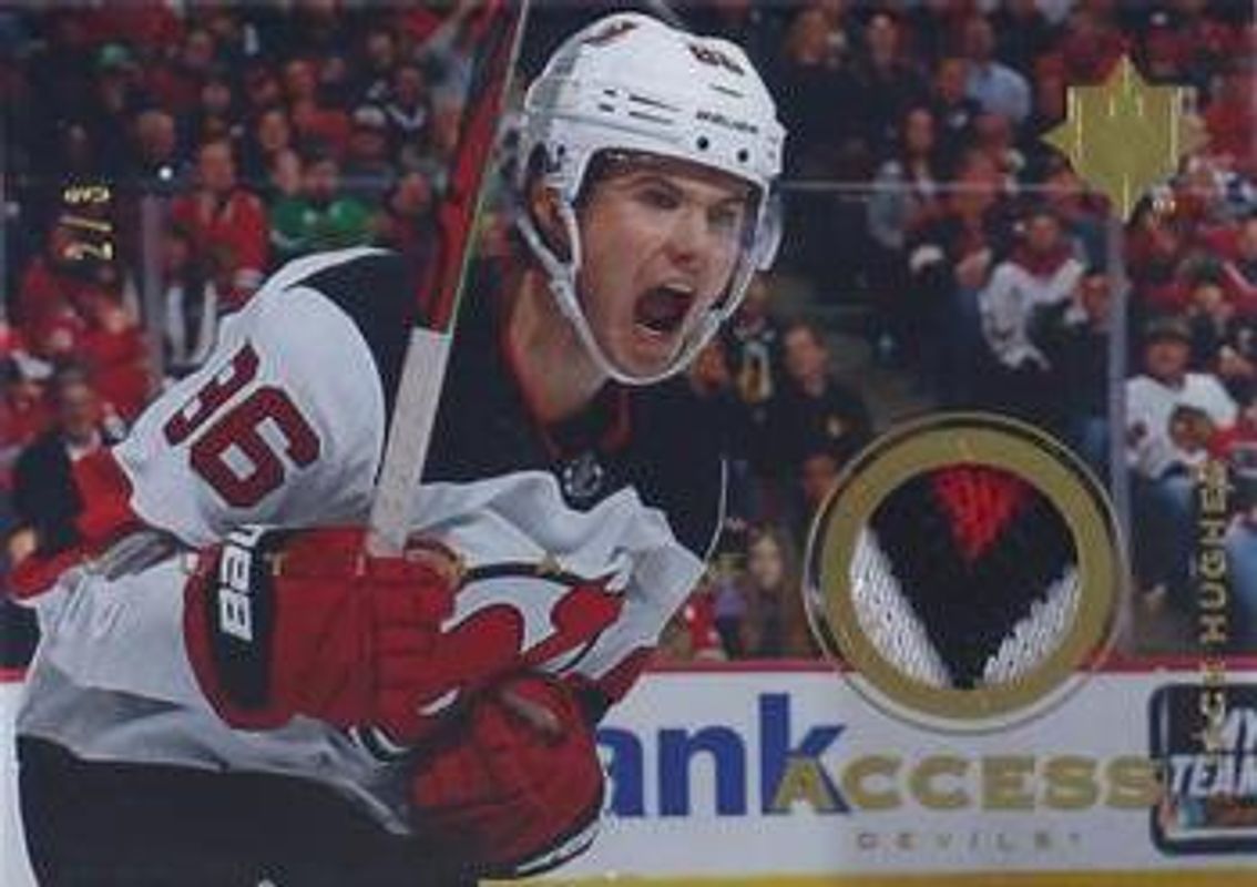 The Jack Hughes 2019 Upper Deck Ultimate Collection #UA-JH Ultimate Access Gold Patch /3 Rookie card is 1 of 29 Jack Hughes' card variations in the 2019 Upper Deck Ultimate Collection set being tracked by Sports Card Investor, including Base /299, Autographed Shields /1, Quest Challenge Achievement VIP Rookies, Signatures Masterpieces, and Ultimate Access Jersey.