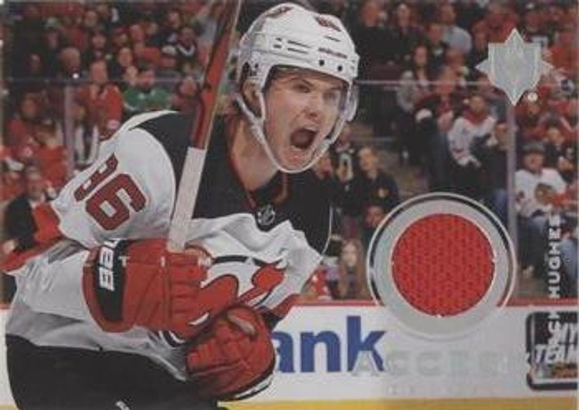 The Jack Hughes 2019 Upper Deck Ultimate Collection #UA-JH Ultimate Access Jersey Rookie card is 1 of 29 Jack Hughes' card variations in the 2019 Upper Deck Ultimate Collection set being tracked by Sports Card Investor, including Base /299, Autographed Shields /1, Quest Challenge Achievement VIP Rookies, Signatures Masterpieces, and Ultimate Introductions.