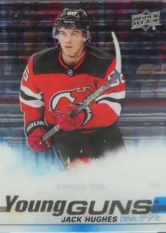 The Jack Hughes 2019 Upper Deck #201 Young Guns - Clear Cut Rookie card in Raw condition has not changed in price in the last 30 days and was last sold for $357.50 .