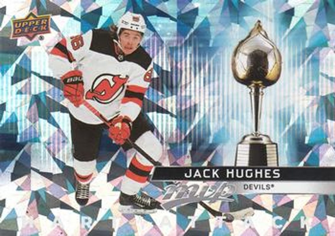 The Jack Hughes 2021 Upper Deck MVP #HA-10 Hart Attack card is 1 of 38 Jack Hughes' card variations in the 2021 Upper Deck MVP set being tracked by Sports Card Investor, including Base, Blue, Gold Script, Ice Battles, and Silver Script.