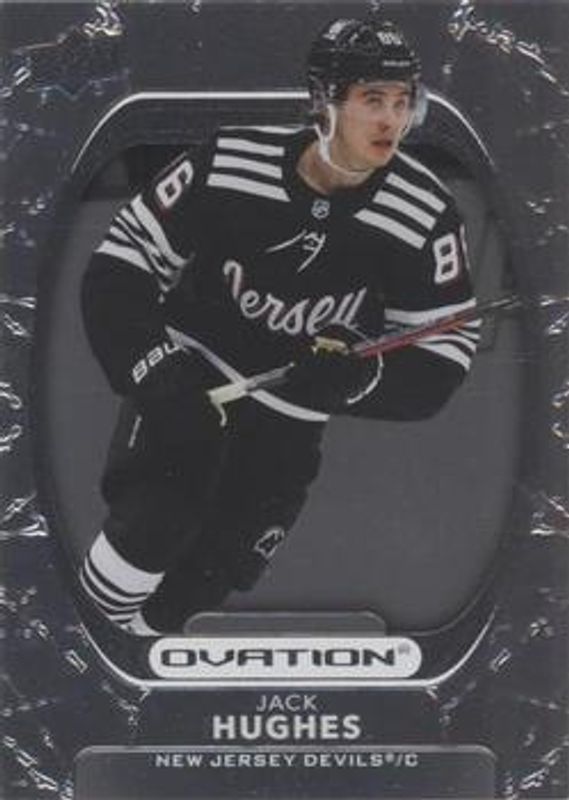 The Jack Hughes 2021 Upper Deck Ovation #99 Silver Foil card is 1 of 14 Jack Hughes' card variations in the 2021 Upper Deck Ovation set being tracked by Sports Card Investor, including Base, Checkerboard, Gold Circular Wonder, Gold Foil, and Standing Ovation /500.