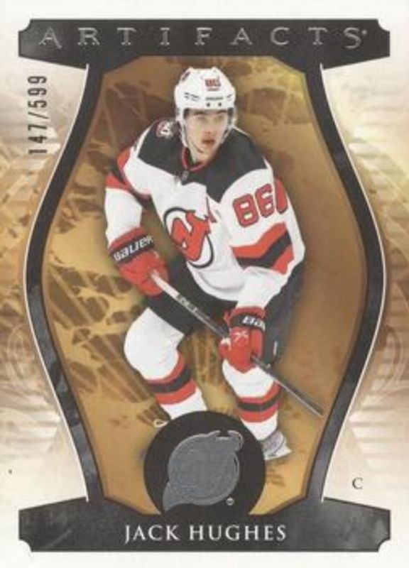 The Jack Hughes 2023 Upper Deck Artifacts #123 Base /999 card is 1 of 32 Jack Hughes' card variations in the 2023 Upper Deck Artifacts set being tracked by Sports Card Investor, including Leather, Plexi, Turquoise, Wood, and Ruby /499.