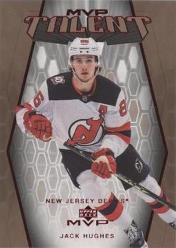 The Jack Hughes 2023 Upper Deck MVP #MT-70 20th Anniversary card is 1 of 19 Jack Hughes' card variations in the 2023 Upper Deck MVP set being tracked by Sports Card Investor, including Base, Gold Script, Ice Battles, Silver Script, and Super Script /25.