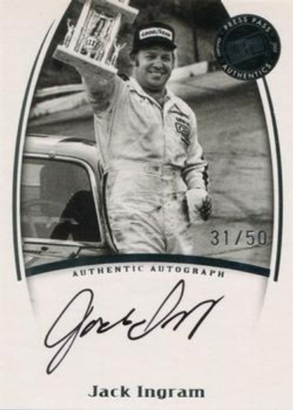 The Jack Ingram 2007 Press Pass Legends Autographs Black /49 card is 1 of 19 Jack Ingram's card variations in the 2007 Press Pass Legends set being tracked by Sports Card Investor, including Base, Solo, Blue /999, Bronze /599, and Gold /249.