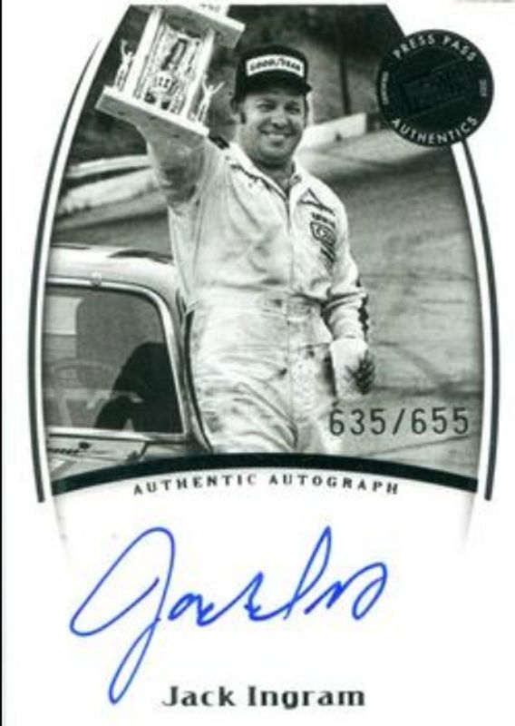 The Jack Ingram 2007 Press Pass Legends Autographs - Blue /562 card is 1 of 19 Jack Ingram's card variations in the 2007 Press Pass Legends set being tracked by Sports Card Investor, including Base, Solo, Blue /999, Bronze /599, and Gold /249.