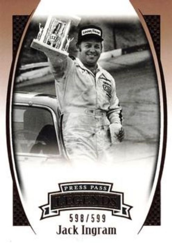 The Jack Ingram 2007 Press Pass Legends #Z-17 Bronze /599 card is 1 of 19 Jack Ingram's card variations in the 2007 Press Pass Legends set being tracked by Sports Card Investor, including Base, Solo, Blue /999, Gold /249, and Holofoil /99.
