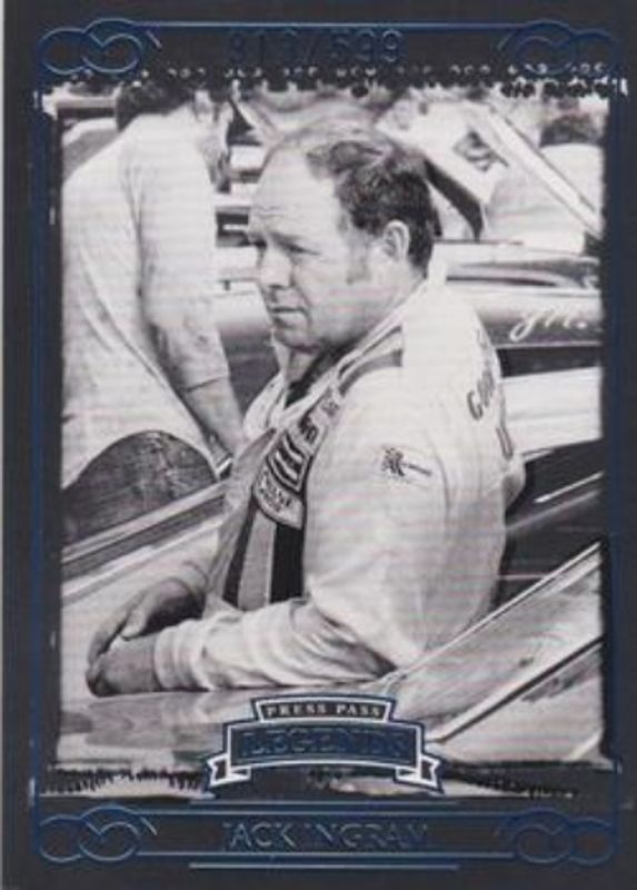 The Jack Ingram 2008 Press Pass Legends #15 Blue /599 card is 1 of 22 Jack Ingram's card variations in the 2008 Press Pass Legends set being tracked by Sports Card Investor, including Base, Bronze /299, Gold /99, Holo /25, and eBay Previews Red /5.