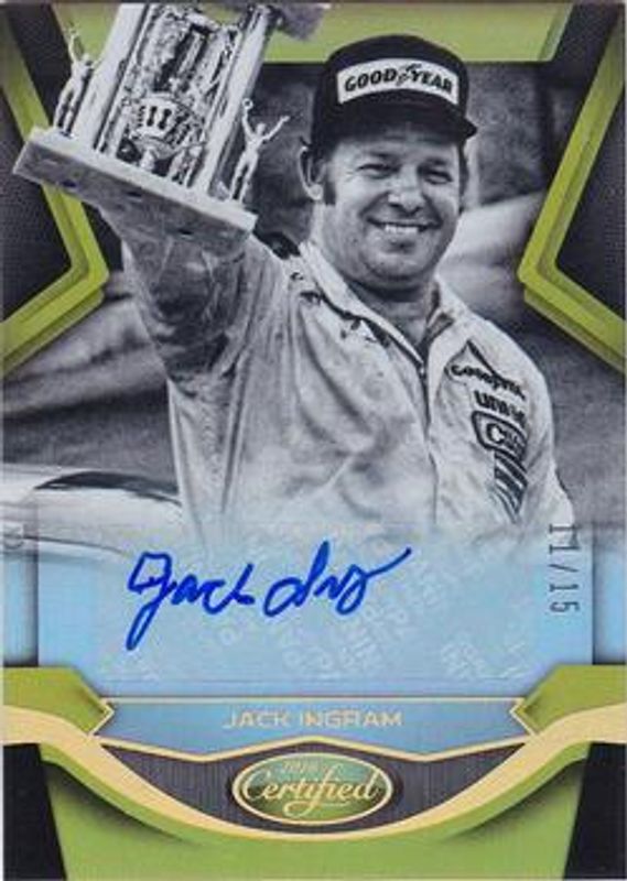 The Jack Ingram 2016 Certified NASCAR #JI Certified Signatures - Mirror Gold /25 card is 1 of 27 Jack Ingram's card variations in the 2016 Certified NASCAR set being tracked by Sports Card Investor, including Base /99, Mirror Red /25, Mirror Blue /20, Mirror Gold /15, and Mirror Orange /15.