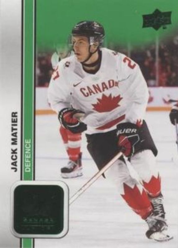 The Jack Matier 2023 Upper Deck Team Canada Juniors #12 Green card is 1 of 68 Jack Matier's card variations in the 2023 Upper Deck Team Canada Juniors set being tracked by Sports Card Investor, including #77 Base, #107 Base, #12 Base, #77 Clear Cut, and #12 Clear Cut.