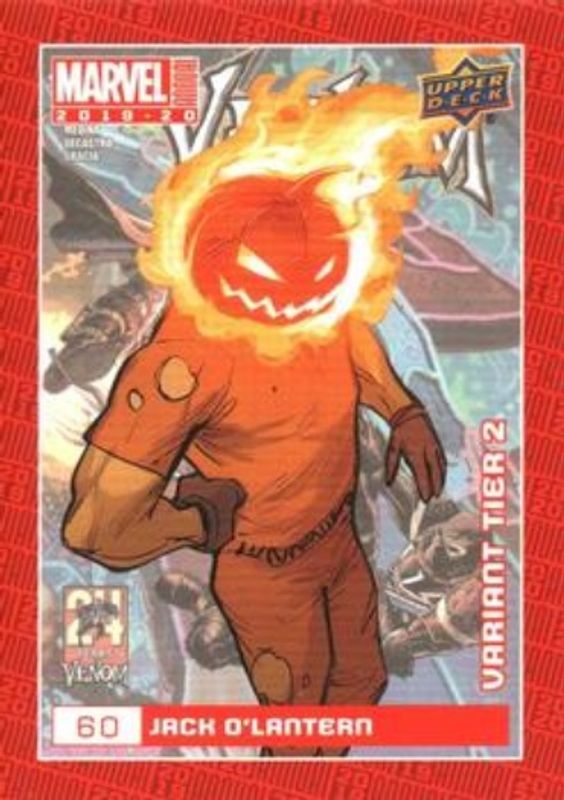 The Jack O'Lantern 2019 Upper Deck Marvel Annual #60 Variant Cover card is 1 of 9 Jack O'Lantern's card variations in the 2019 Upper Deck Marvel Annual set being tracked by Sports Card Investor, including Base, Fractal, Pack Wars, Hologram /20, and Printing Plate Cyan /1.