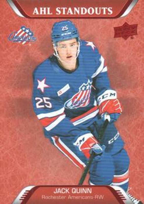 The Jack Quinn 2020 Upper Deck AHL #225 Red card is 1 of 12 Jack Quinn's card variations in the 2020 Upper Deck AHL set being tracked by Sports Card Investor, including #193 Base, #225 Base, #193 UD Exclusives /100, #225 Gold /25, and #193 UD High Gloss /10.