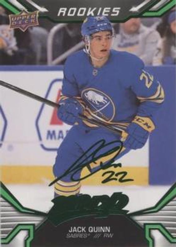 The Jack Quinn 2022 Upper Deck MVP #228 Green Script Rookie card is 1 of 28 Jack Quinn's card variations in the 2022 Upper Deck MVP set being tracked by Sports Card Investor, including Base, Blue Script, Gold Script, Ice Battles, and Silver Script.