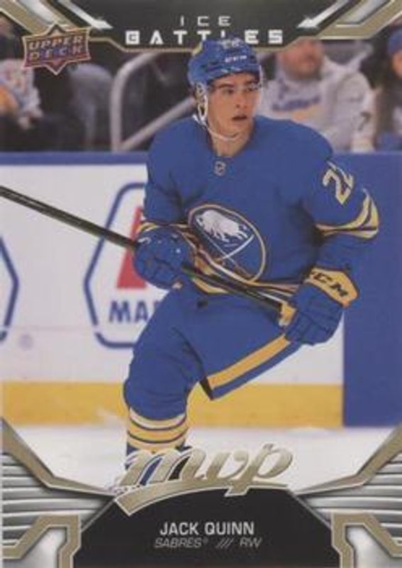 The Jack Quinn 2022 Upper Deck MVP #228 Ice Battles - Gold Rookie card is 1 of 28 Jack Quinn's card variations in the 2022 Upper Deck MVP set being tracked by Sports Card Investor, including Base, Blue Script, Gold Script, Ice Battles, and Silver Script.