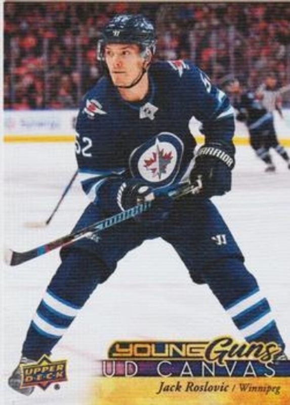 The Jack Roslovic 2017 Upper Deck #C108 Young Guns Canvas Rookie card is 1 of 27 Jack Roslovic's card variations in the 2017 Upper Deck set being tracked by Sports Card Investor, including Young Guns Base, Gold Rainbow Foil, Silver Foil, Young Guns - Clear Cut, and Young Guns - Gold Rainbow Foil.