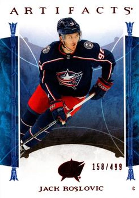 The Jack Roslovic 2022 Upper Deck Artifacts #29 Ruby /499 card is 1 of 21 Jack Roslovic's card variations in the 2022 Upper Deck Artifacts set being tracked by Sports Card Investor, including Base /999, Turquoise, Copper /299, Royal Blue /199, and Emerald /99.