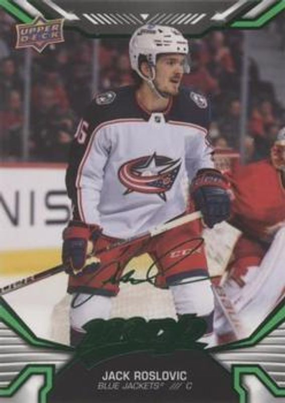 The Jack Roslovic 2022 Upper Deck MVP #212 Green Script card is 1 of 17 Jack Roslovic's card variations in the 2022 Upper Deck MVP set being tracked by Sports Card Investor, including Base, Blue Script, Gold Script, Ice Battles, and Silver Script.