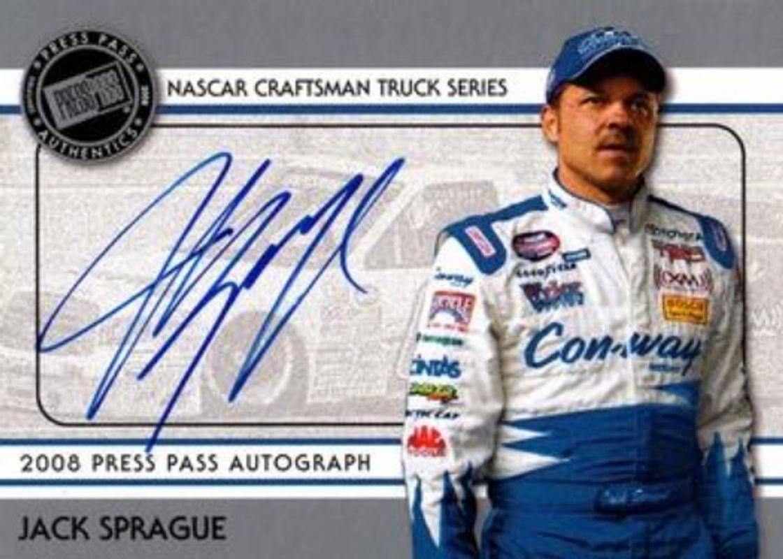 The Jack Sprague 2008 Press Pass Autographs card is 1 of 11 Jack Sprague's card variations in the 2008 Press Pass set being tracked by Sports Card Investor, including Base, Blue, Gold, Platinum /100, and Autographs Press Plates Black.