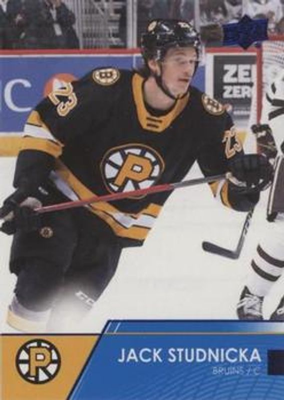 The Jack Studnicka 2021 Upper Deck AHL #84 Blue card is 1 of 9 Jack Studnicka's card variations in the 2021 Upper Deck AHL set being tracked by Sports Card Investor, including Base, Exclusives /100, High Gloss /10, Autographs, and Printing Plates - Black /1.