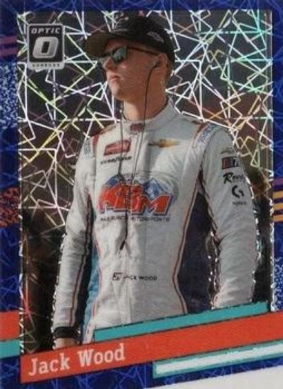 The Jack Wood 2024 Donruss NASCAR #145 Optic Blue Velocity card is 1 of 28 Jack Wood's card variations in the 2024 Donruss NASCAR set being tracked by Sports Card Investor, including Base, Optic, Optic Black Pandora, Optic Holo, and Optic Orange Velocity.