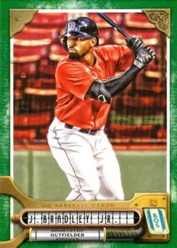 The Jackie Bradley Jr. 2022 Topps Gypsy Queen #126 Green card is 1 of 14 Jackie Bradley Jr.'s card variations in the 2022 Topps Gypsy Queen set being tracked by Sports Card Investor, including Base, Missing Black Plate, Missing Nameplate, Team Logo Swap, and Burnt Umber /399.