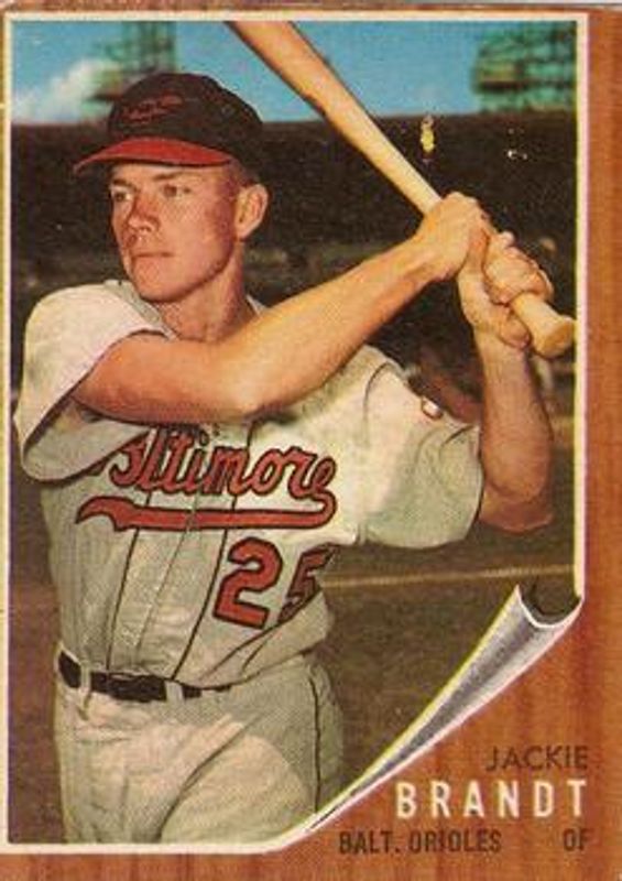 The Jackie Brandt 1962 Topps #165a Base card is 1 of 3 Jackie Brandt's card variations in the 1962 Topps set being tracked by Sports Card Investor, including Base, and Stamps.