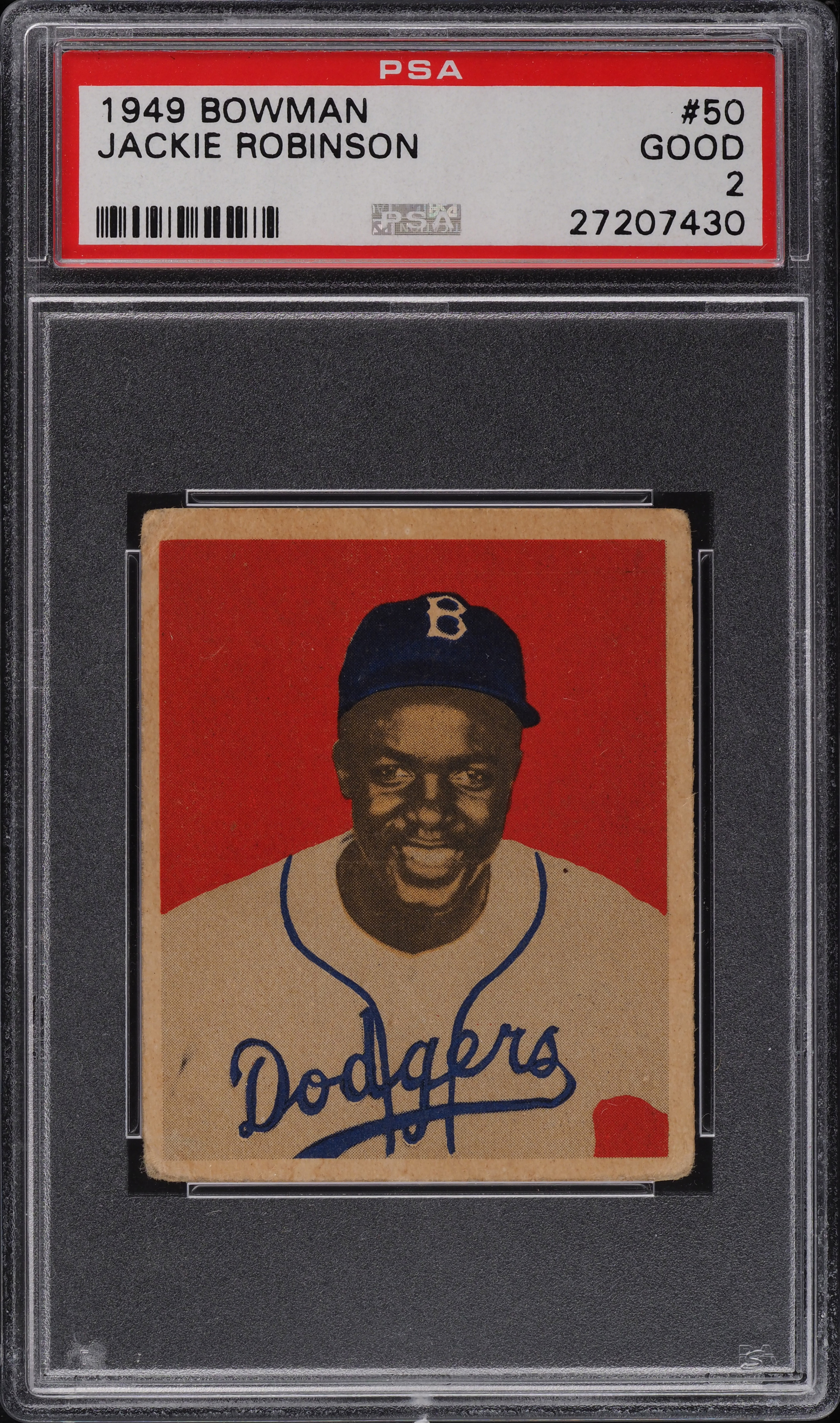 The Jackie Robinson 1949 Bowman #50 Base card in PSA 2 condition has moved up $1.34K (+38.2%) in the last 30 days and was last sold for $4,838.00 .