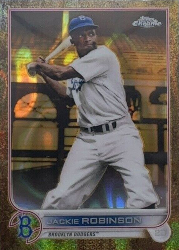 This card is 1 of 6 Jackie Robinson's card variations in the 2022 Topps Gilded Collection set being tracked by Sports Card Investor, including Base /99, Mini-Diamond Gold Etch Refractor /50, RayWave Gold Etch Refractor /25, Superfractor /1, and Topps Cut Signatures /1.