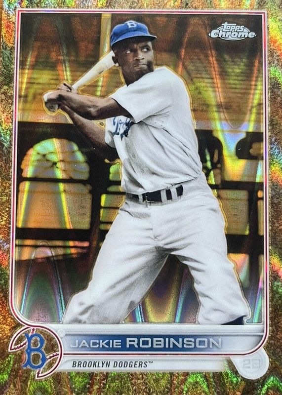This card is 1 of 6 Jackie Robinson's card variations in the 2022 Topps Gilded Collection set being tracked by Sports Card Investor, including Base /99, Mini-Diamond Gold Etch Refractor /50, Lava Gold Etch Refractor /10, Superfractor /1, and Topps Cut Signatures /1.