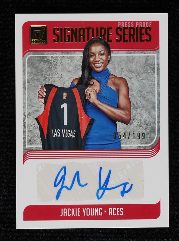 The Jackie Young 2019 Donruss WNBA #SS-JYG Signatures Series - Press Proof /199 Rookie card is 1 of 19 Jackie Young's card variations in the 2019 Donruss WNBA set being tracked by Sports Card Investor, including Base, Optic, Optic Holo, Silver Press Proof /199, and Purple Press Proof /99.