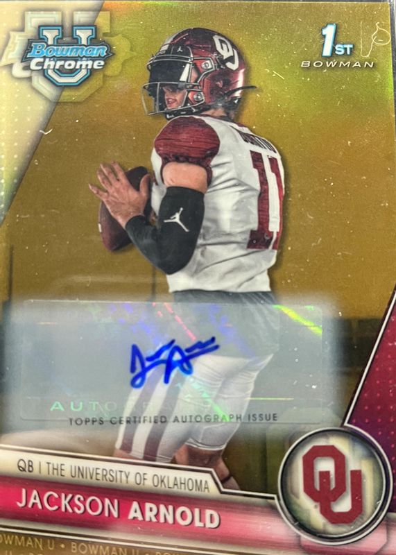 This card is 1 of 25 Jackson Arnold's card variations in the 2023 Bowman Chrome University set being tracked by Sports Card Investor, including Prospects - SP Variation, Prospect Auto (1st), Prospect Auto - Refractor /499 (1st), Prospect Auto - Fuchsia Mini-Diamond Refractor /150 (1st), and The Big Kahuna Autographs /150.
