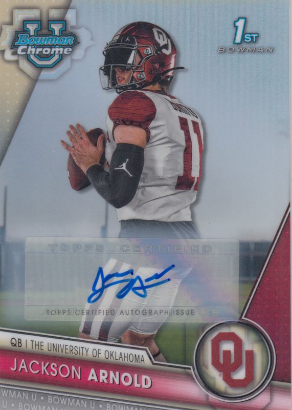 This card is 1 of 25 Jackson Arnold's card variations in the 2023 Bowman Chrome University set being tracked by Sports Card Investor, including Prospects - SP Variation, Prospect Auto (1st), Prospect Auto - Fuchsia Mini-Diamond Refractor /150 (1st), The Big Kahuna Autographs /150, and 1955 Bowman Football Autographs /99.