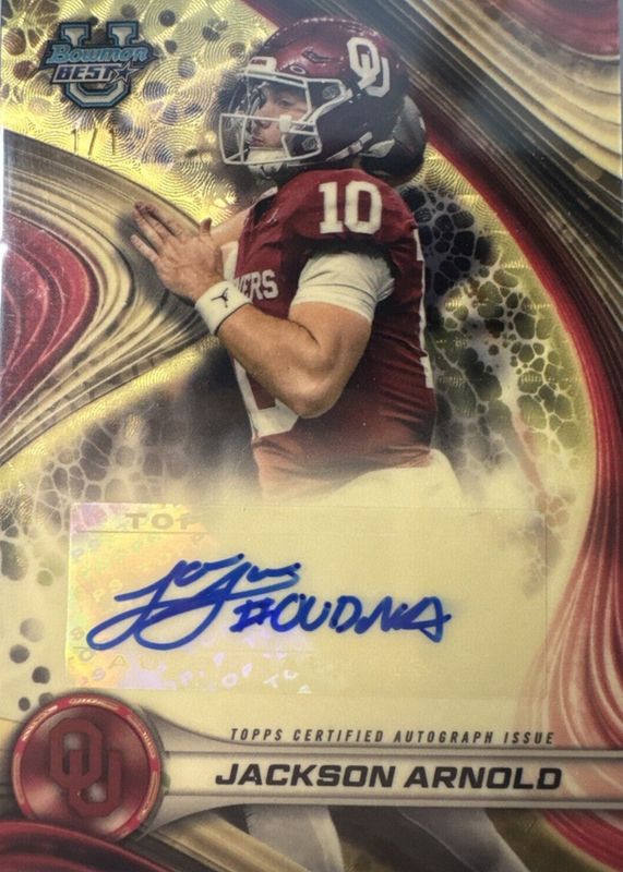 This card is 1 of 15 Jackson Arnold's card variations in the 2024 Bowman Best University set being tracked by Sports Card Investor, including Best of 2024 Autographs - Refractor, Best of 2024 Autographs - Pink Lava Refractor /100, Best of 2024 Autographs - Green Mini-Diamond Refractor /99, Best of 2024 Autographs - Yellow Refractor /75, and Best of 2024 Autographs - Gold Refractor /50.