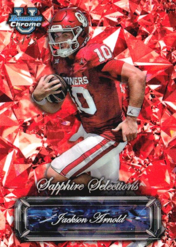 This card is 1 of 11 Jackson Arnold's card variations in the 2024 Bowman Chrome University Sapphire Edition set being tracked by Sports Card Investor, including Sapphire Selections, Sapphire Selections Autographs, Treasured Talent /(SSP), Sapphire Selections Autographs - Orange /25, and Sapphire Selections Autographs - Black /10.