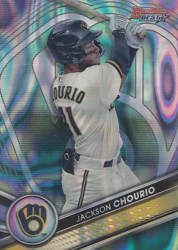 This card is 1 of 21 Jackson Chourio's card variations in the 2022 Bowman's Best set being tracked by Sports Card Investor, including Top Prospects, Top Prospects - Atomic Refractor, Top Prospects - Refractor, Top Prospects - Mini-Diamond Refractor /299, and Top Prospects - Purple Refractor /250.