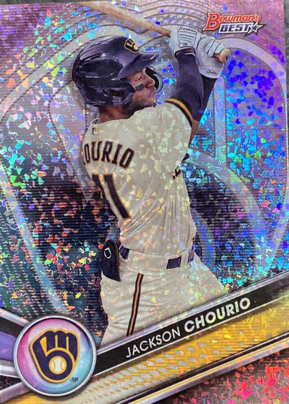 This card is 1 of 21 Jackson Chourio's card variations in the 2022 Bowman's Best set being tracked by Sports Card Investor, including Top Prospects, Top Prospects - Atomic Refractor, Top Prospects - Refractor, Top Prospects - Purple Refractor /250, and Top Prospects - Aqua Lava Refractor /199.