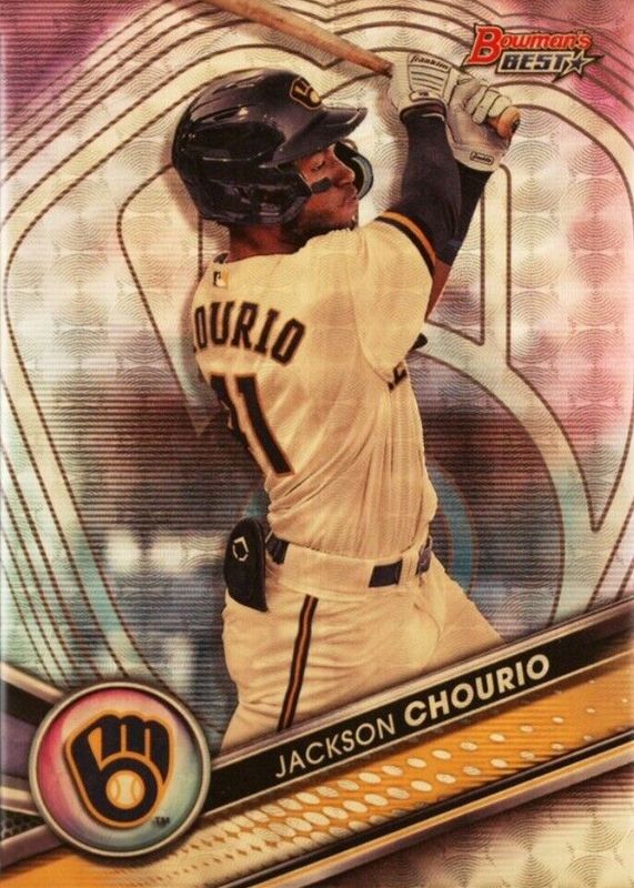 This card is 1 of 21 Jackson Chourio's card variations in the 2022 Bowman's Best set being tracked by Sports Card Investor, including Top Prospects, Top Prospects - Atomic Refractor, Top Prospects - Refractor, Top Prospects - Mini-Diamond Refractor /299, and Top Prospects - Purple Refractor /250.