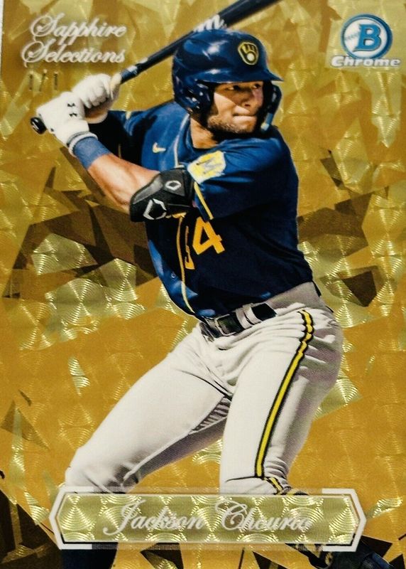 The Jackson Chourio 2023 Bowman Chrome Sapphire Edition #BSS-3 Sapphire Selections - Superfractor /1 card in Raw condition has not changed in price in the last 30 days and was last sold for $1,075.00 .