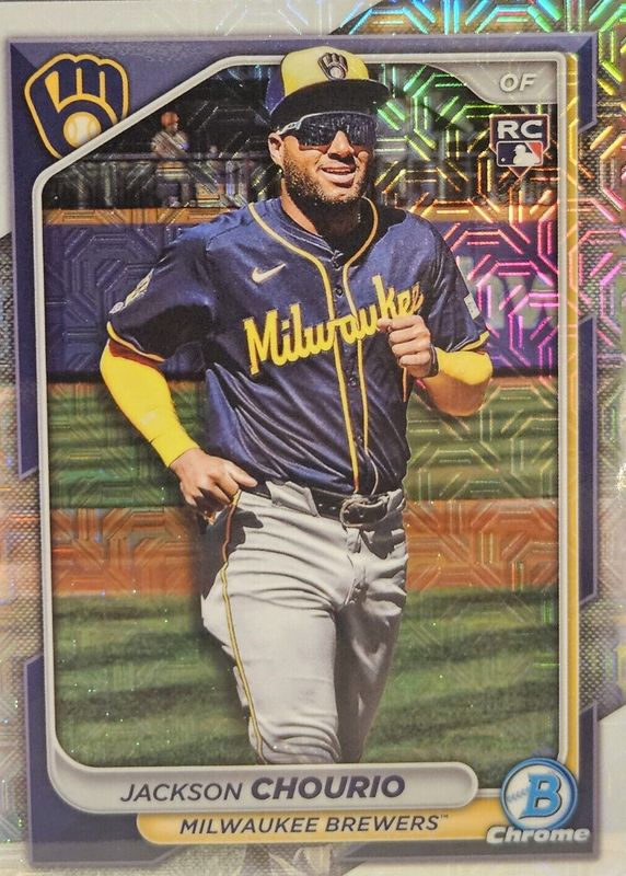 This card is 1 of 32 Jackson Chourio's card variations in the 2024 Bowman Chrome Mega Box set being tracked by Sports Card Investor, including Base, Aqua Mojo Refractor /299, Purple Mojo Refractor /250, Pink Mojo Refractor /199, and Blue Mojo Refractor /150.