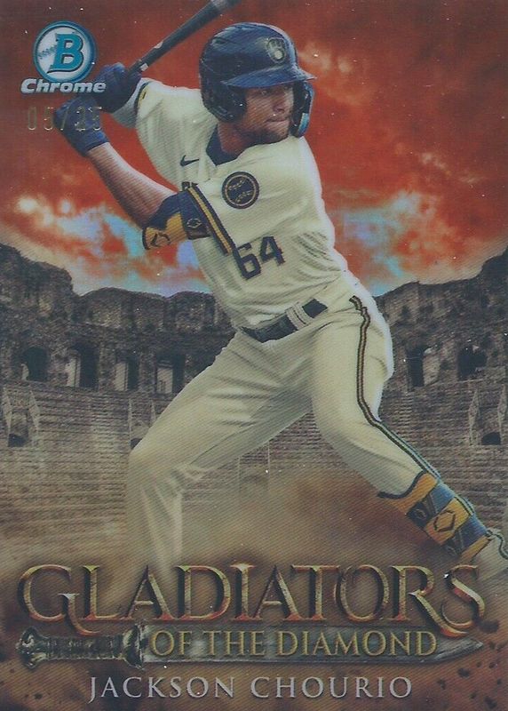 The Jackson Chourio 2024 Bowman #GOTD-7 Gladiators of the Diamond - Orange Refractor /25 Rookie card in Raw condition has not changed in price in the last 30 days and was last sold for $51.07 .