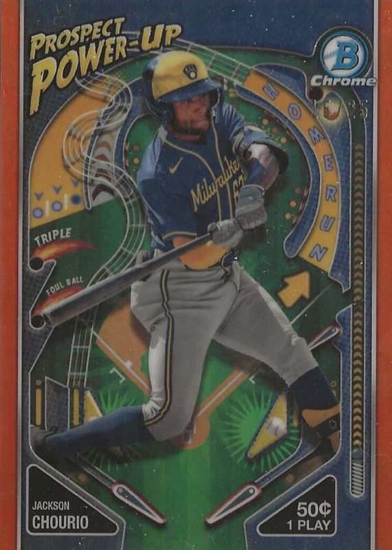 The Jackson Chourio 2024 Bowman #PP-6 Prospect Power-Up - Orange Refractor /25 Rookie card in Raw condition has not changed in price in the last 30 days and was last sold for $52.77 .