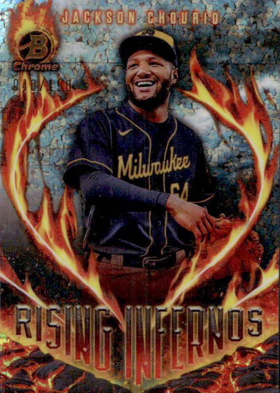 Best Prices Available For Sale of Jackson Chourio 2024 Bowman #RI-20 Rising Infernos - Mini-Diamond Refractor /150