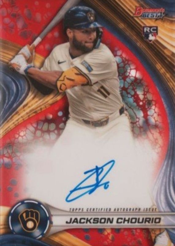 Auctions Ending Soon for Jackson Chourio 2024 Bowman's Best #B24-JC Best of 2024 Autographs - Red Refractor /5 Rookie RAW