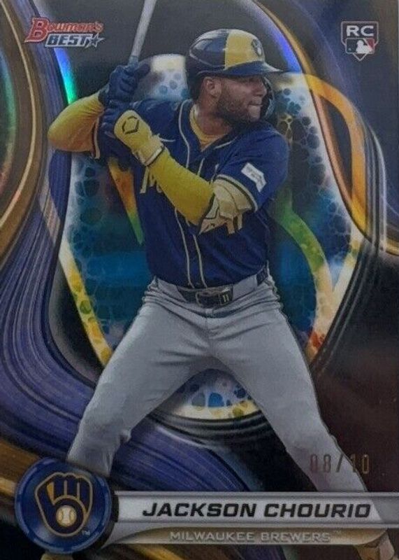 This card is 1 of 33 Jackson Chourio's card variations in the 2024 Bowman's Best set being tracked by Sports Card Investor, including Base, Refractor, Wave Refractor, Mini-Diamond Refractor /299, and Purple Mojo Refractor /250.