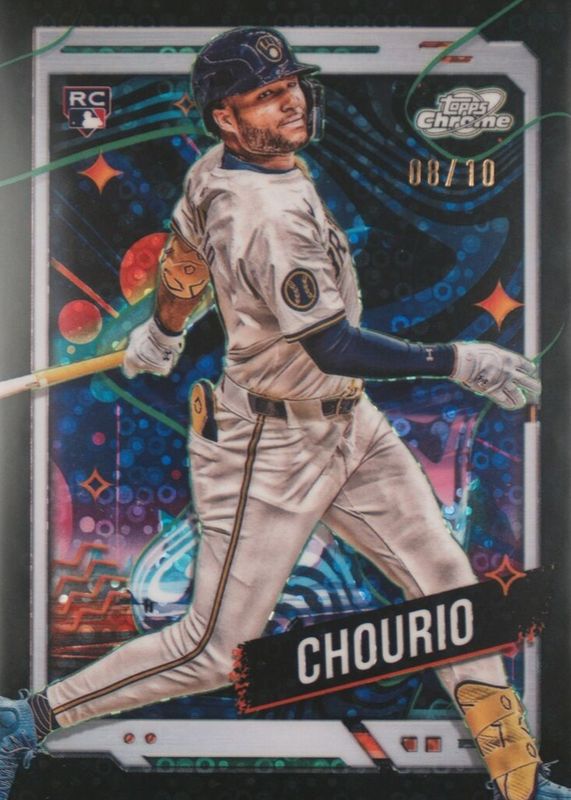 The Jackson Chourio 2024 Topps Chrome Cosmic #179 Black Eclipse Refractor /10 Rookie card in Raw condition has not changed in price in the last 30 days and was last sold for $381.88 .