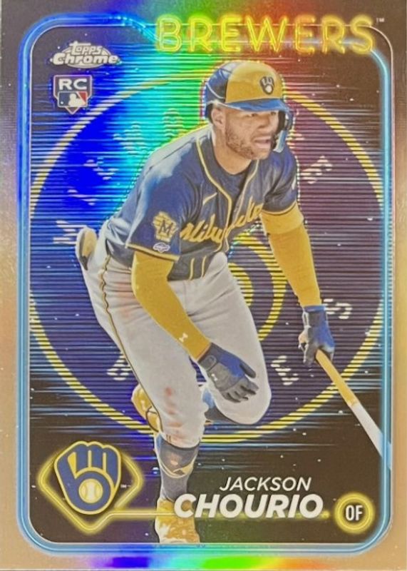 The Jackson Chourio 2024 Topps Chrome #161 Lightboard Logo Refractor Rookie card is 1 of 72 Jackson Chourio's card variations in the 2024 Topps Chrome set being tracked by Sports Card Investor, including Base, Image Variation (Cap at Chest), Negative Refractor, Pink Refractor, and Prism Refractor.