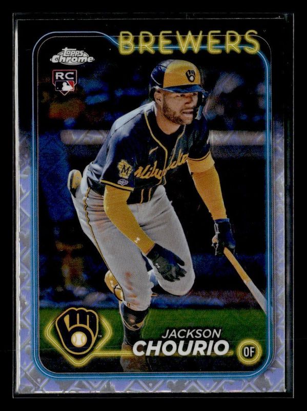 The Jackson Chourio 2024 Topps Chrome Logofractor Edition #161 Base Rookie card is 1 of 10 Jackson Chourio's card variations in the 2024 Topps Chrome Logofractor Edition set being tracked by Sports Card Investor, including Purple /250, Aqua /199, Blue /150, Green /99, and Gold /50.