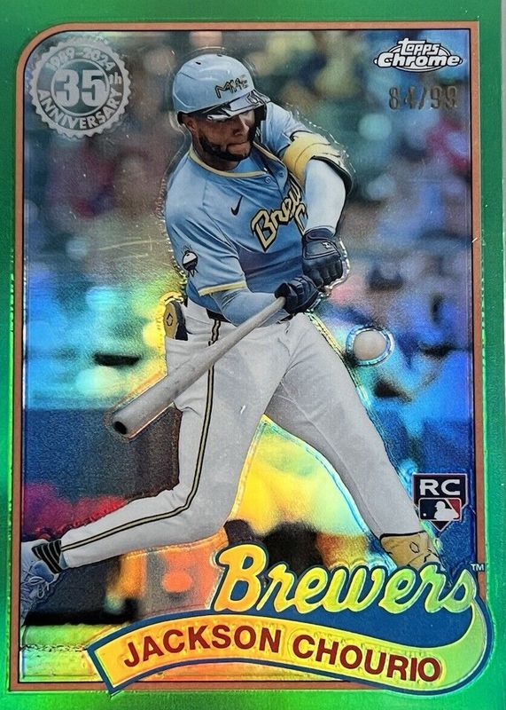 The Jackson Chourio 2024 Topps Chrome Update #89CU-4 1989 Topps - Green Refractor /99 Rookie card in Raw condition has not changed in price in the last 30 days and was last sold for $45.00 .